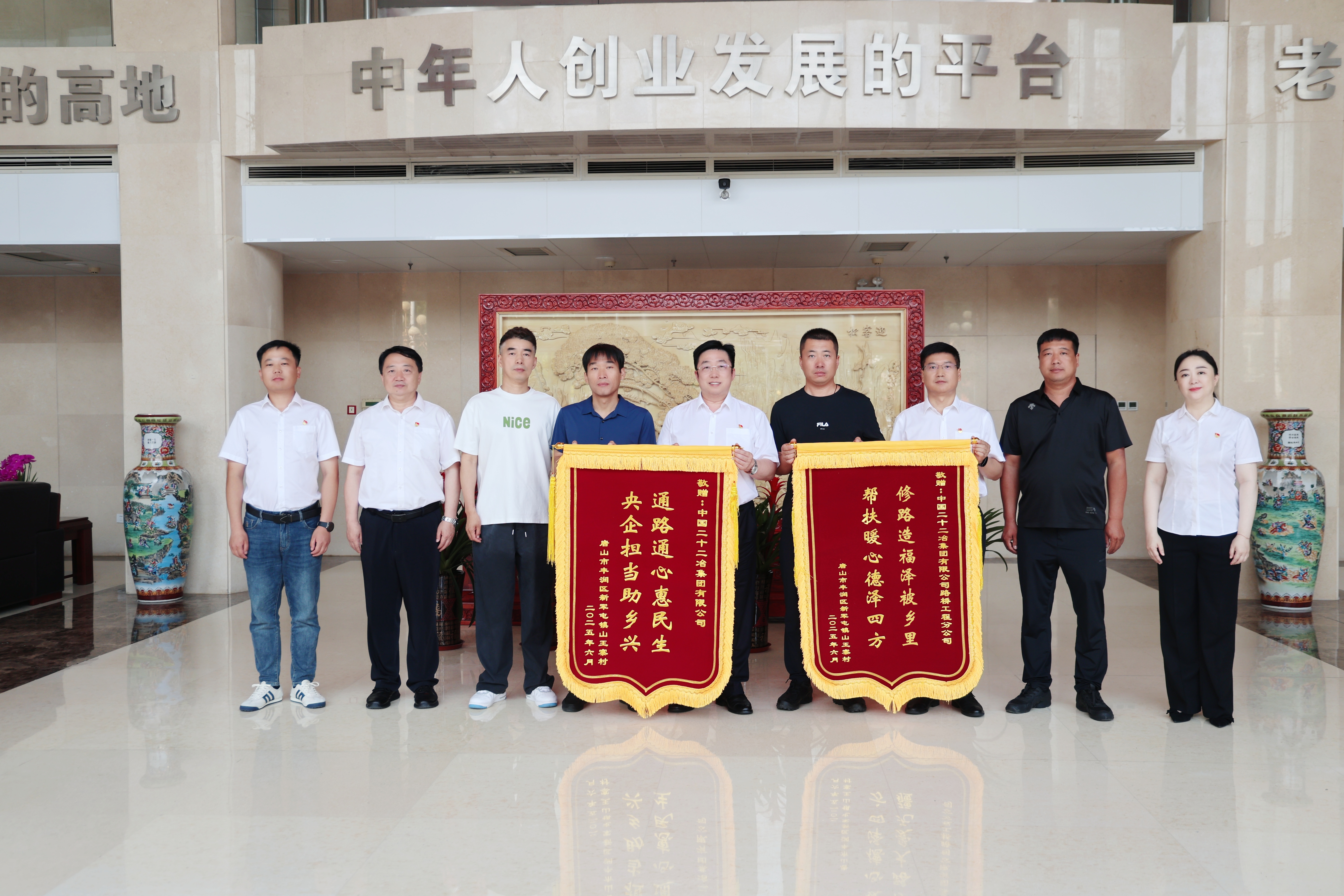 6月18日,唐山市总工会副主席付竞楠一行来到中国二十二冶办公大楼,将写着“通路通心惠民生 央企担当助乡兴”和“修路造福泽被乡里 帮扶暖心德泽四方”的两面锦旗送到了公司领导手中,表达对中国二十二冶路桥分公司倾力帮扶的深深谢意。