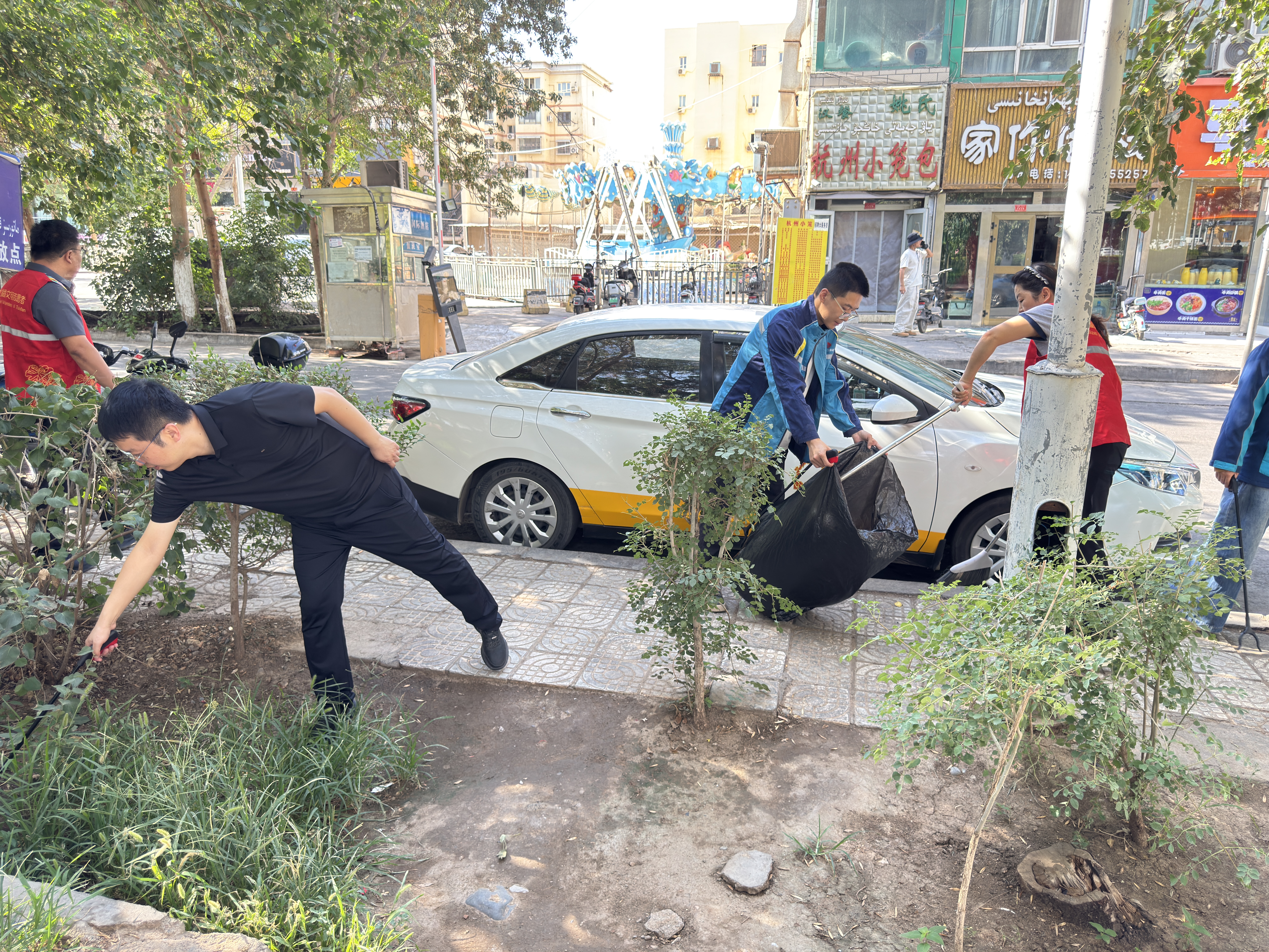 活动中,全体职工分工协作、默契配合,手持扫帚、垃圾钳等清洁工具,对项目周边绿化带及主要通行道路展开了全面清扫。一部分人细致清扫地面落叶与杂物,一部分人认真擦拭宣传栏、扶手等公共设施,还有专人负责收集和清运积存垃圾,并对平日易忽略的卫生死角进行彻底清理。现场气氛热烈,忙碌中不失条理,高温下更显担当。