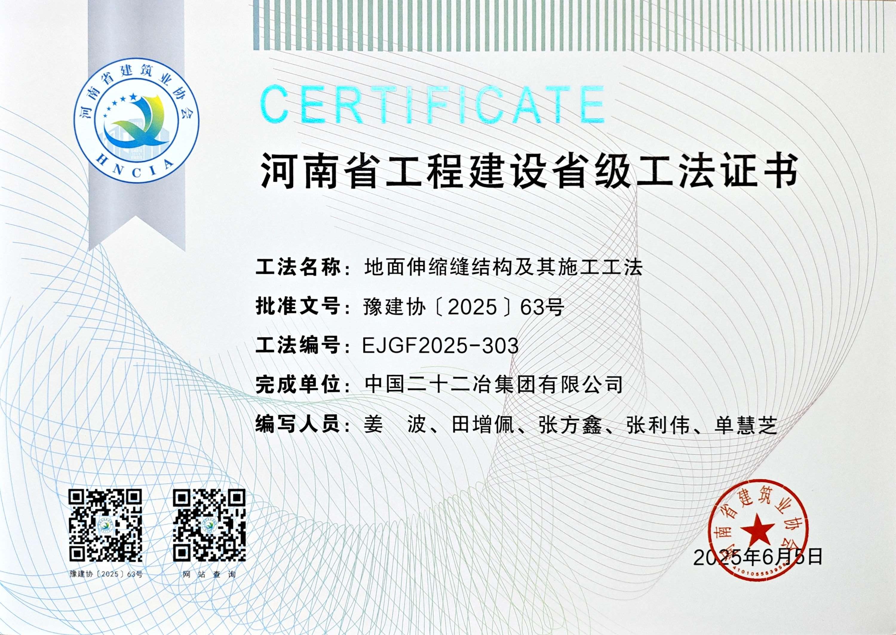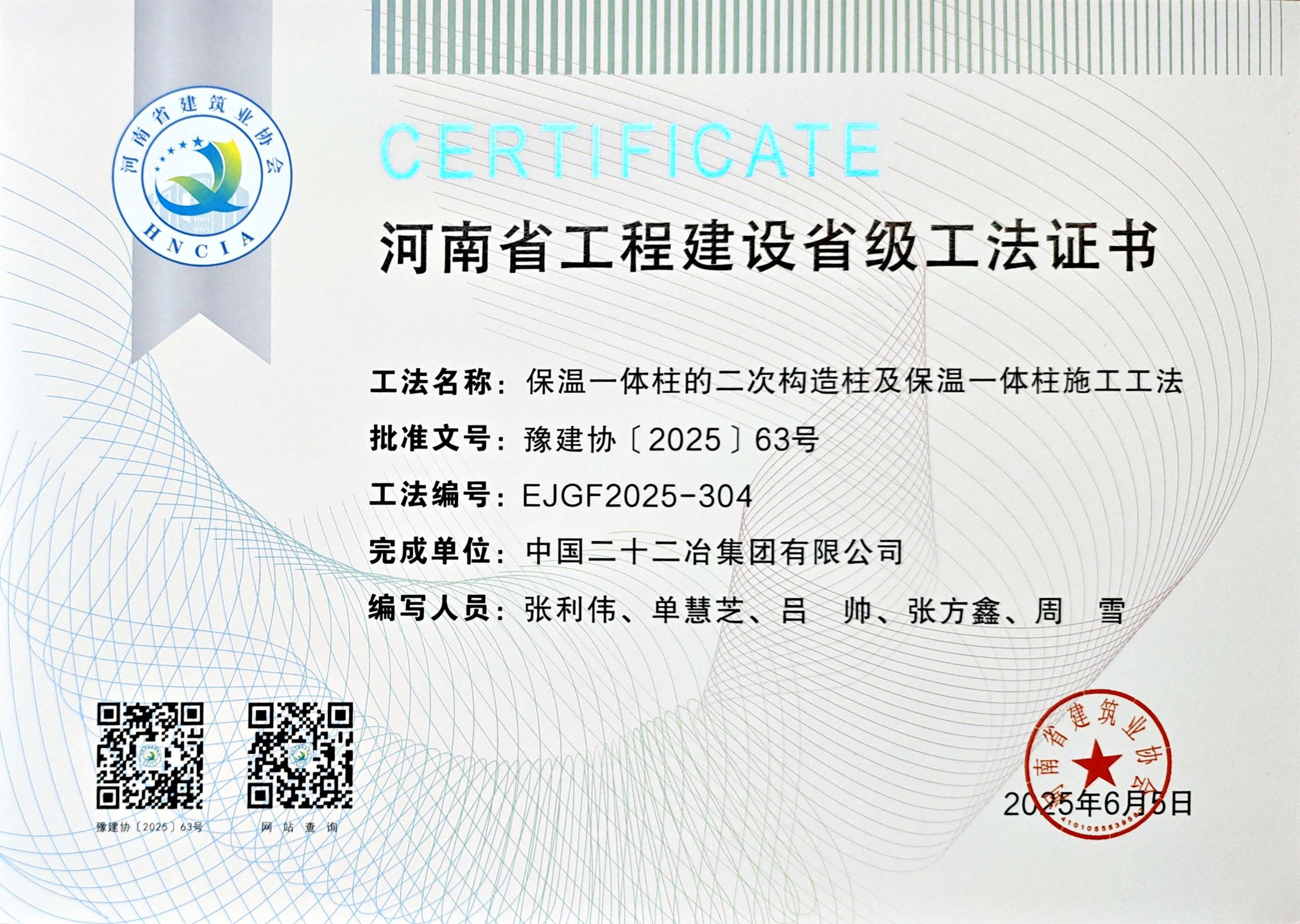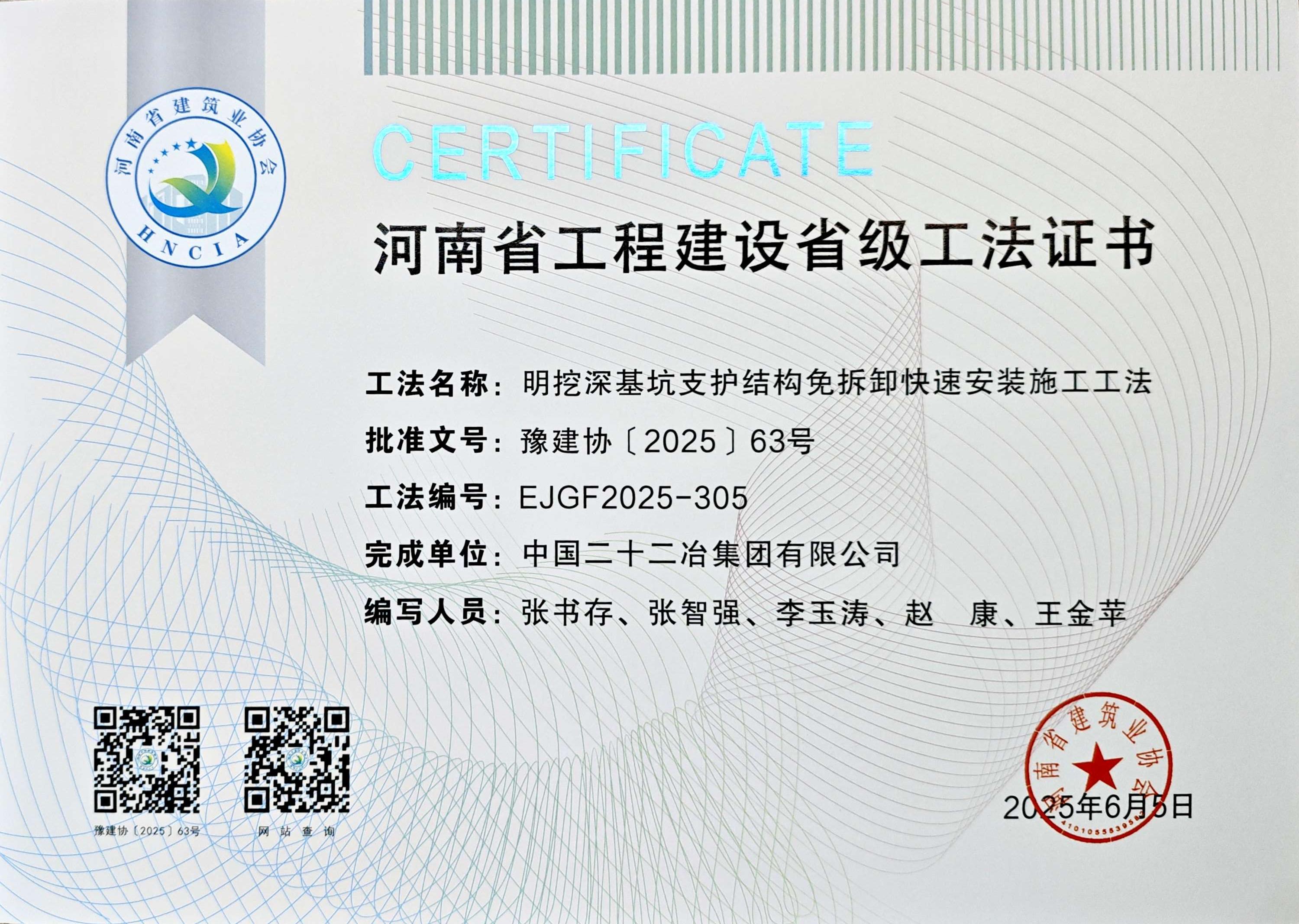 近日,河南省建筑业协会公布2025年度第一批河南省省级工法名单中,山东公司申报的《明挖深基坑支护结构免拆卸快速安装施工工法》《地面伸缩缝结构及其施工工法》《保温一体柱的二次构造柱及保温一体柱施工工法》成功获评,彰显了公司在施工技术创新与实践应用领域再结硕果。