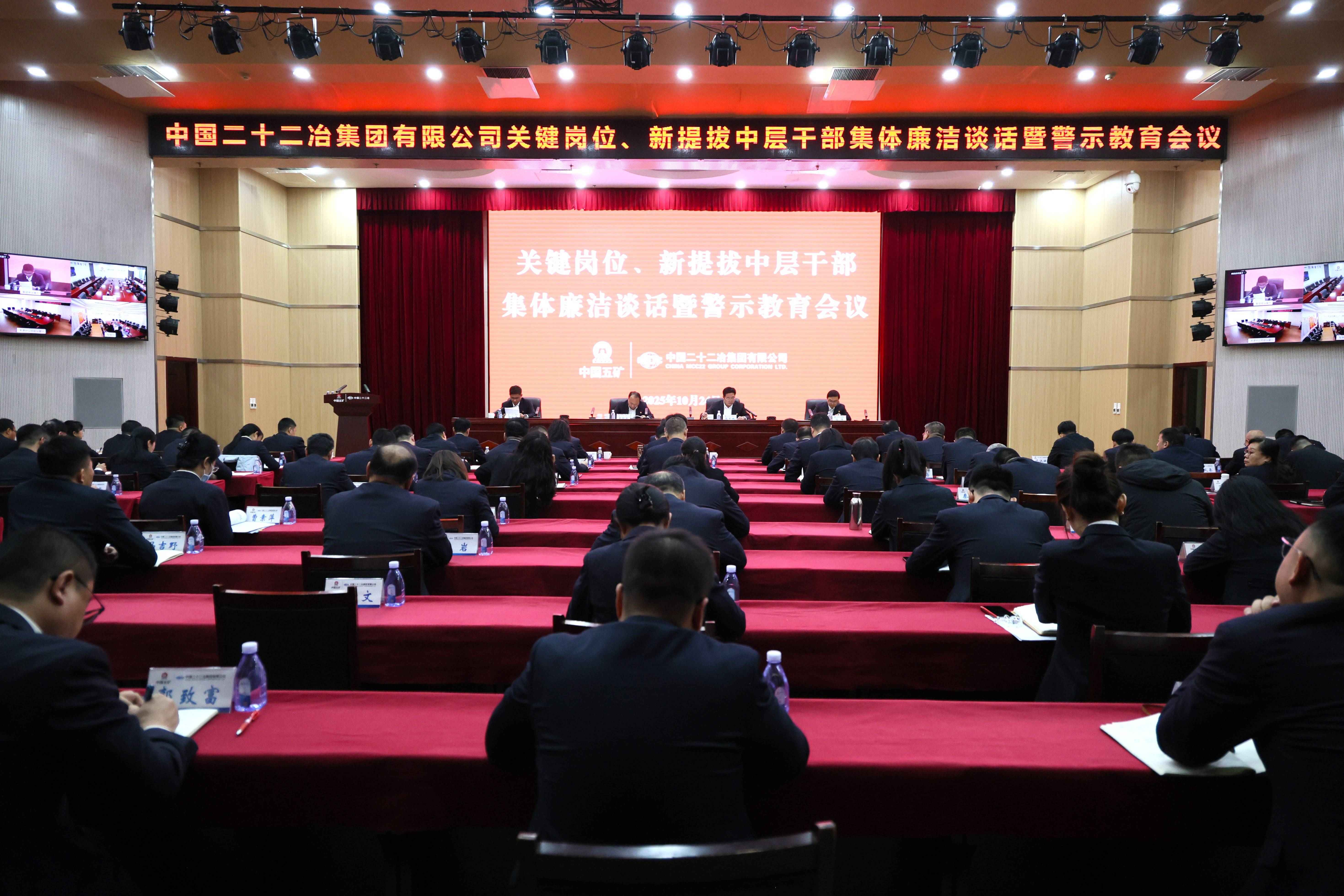 10月24日,中国二十二冶召开关键岗位、新提拔中层干部集体廉洁谈话暨警示教育会。中国二十二冶党委书记、董事长袁斯浪出席会议并讲话,党委副书记、职工董事张育鹏主持会议并作集体任职谈话,纪委书记田和平做警示教育和集体廉洁谈话。