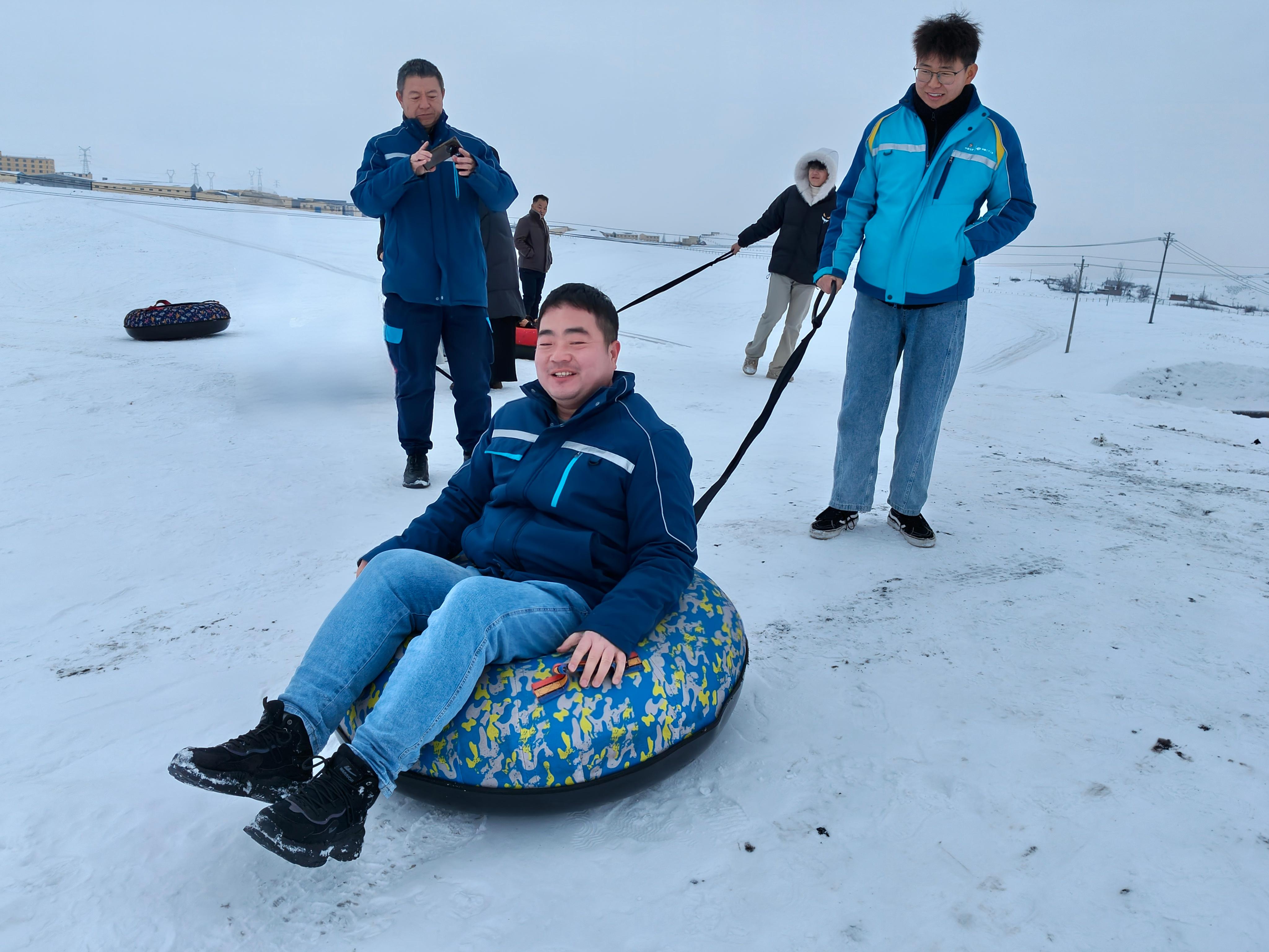 活动现场气氛热烈,职工们活力满满。大家双手抓紧滑雪圈拉绳,发力向前滑行,雪圈在雪地上划出一道道痕迹。众人在滑行过程中互相配合,彼此照应,共同享受滑雪带来的乐趣,现场不时传来阵阵欢声笑语。