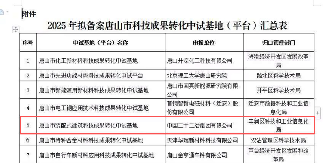 近日,经唐山市科学技术局审核与公示,由装配式公司牵头申报的“唐山市装配式建筑科技成果转化中试基地”成功入选2025年度唐山市科技成果转化中试基地示范(平台),标志着公司在装配式建筑领域的科研实力与成果转化能力获得市级认可与支持。
