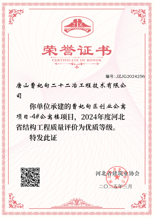 近日,曹妃甸技术公司曹妃甸区创业公寓项目1、2、4号公寓楼分别荣获河北省结构优质工程奖。