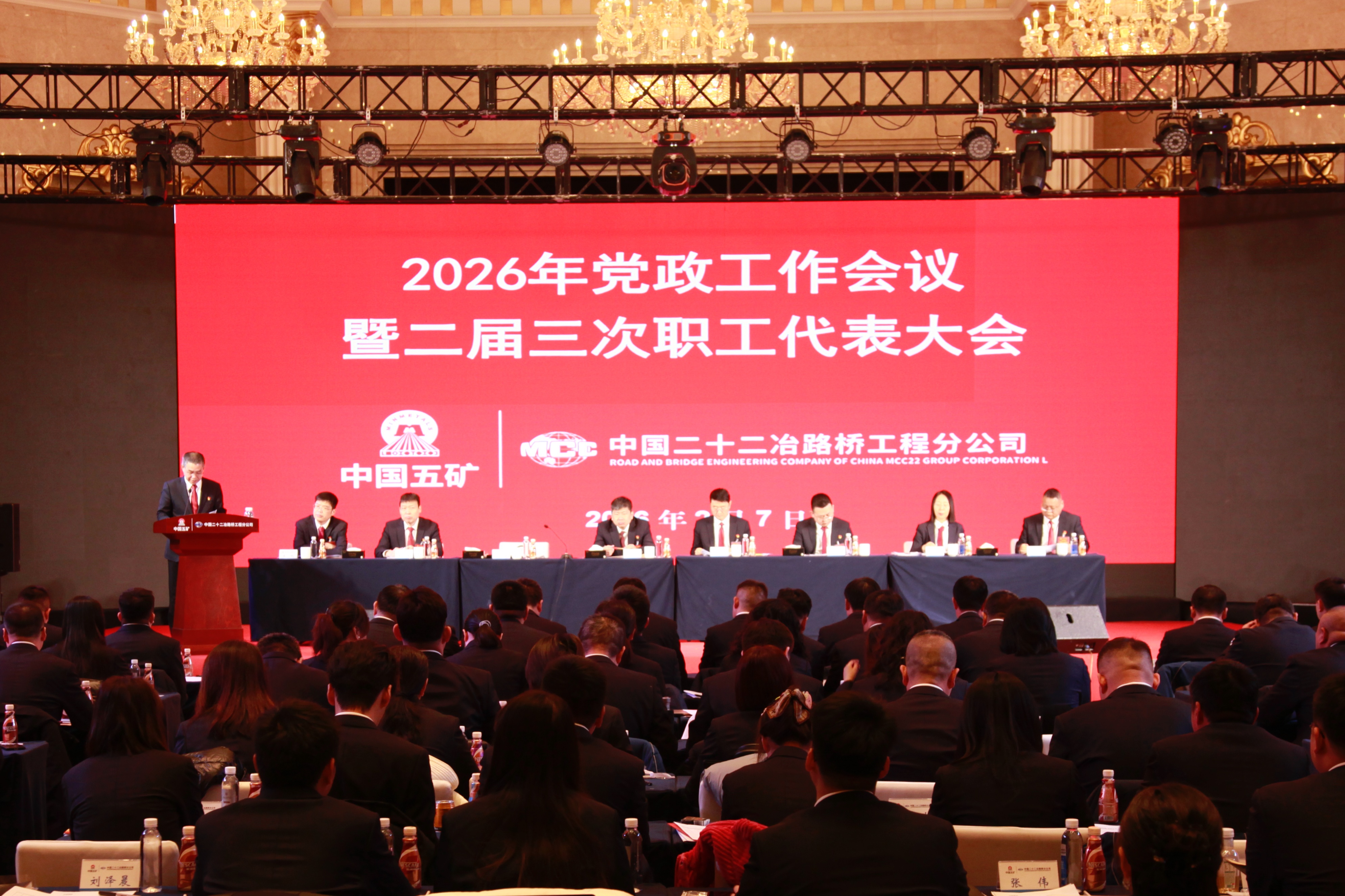 2月7日,路桥公司召开2026年党政工作会议暨二届三次职工代表大会。大会传达了中国五矿、中国中冶和中国二十二冶2026年度工作会议精神,路桥公司总经理、党委副书记荣太龙作了题为《奋楫笃行提质效 聚势革新促转型 为助力中国二十二冶开启“两步走、再转型,提质增效启新程”的高质量发展而努力奋斗》的行政工作报告,路桥公司党委书记、工会主席、副总经理牛锋作了题为《锚定高质量 攻坚开新局 以党建硬核力量赋能豪迈路桥十五五开局启新程》的党委工作报告和《赋能职工促发展 继往开来建新功 汇聚全体职工磅礴力量 为谱写公司崭新篇章不懈奋斗》的工会工作报告。会议由路桥公司纪委书记宋华伟主持。