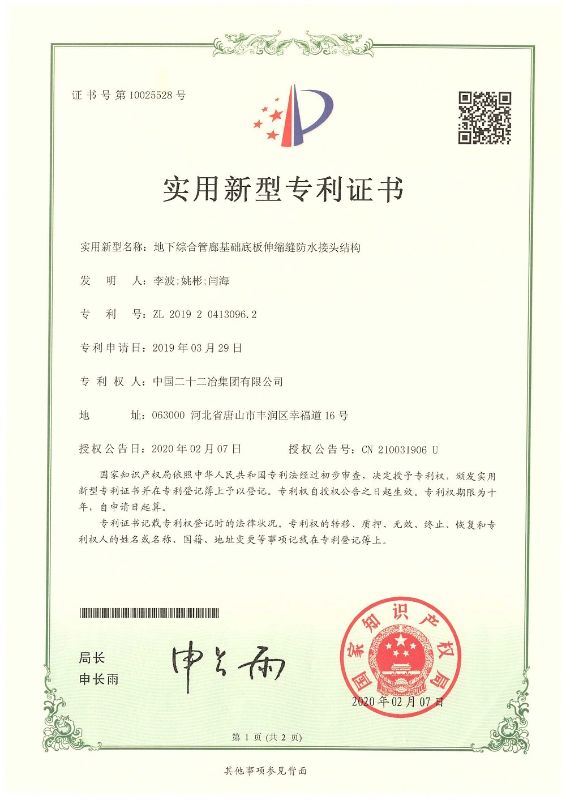 一公司《地下综合管廊基础底板伸缩缝防水接头结构》获国家实用新型专利授权。
