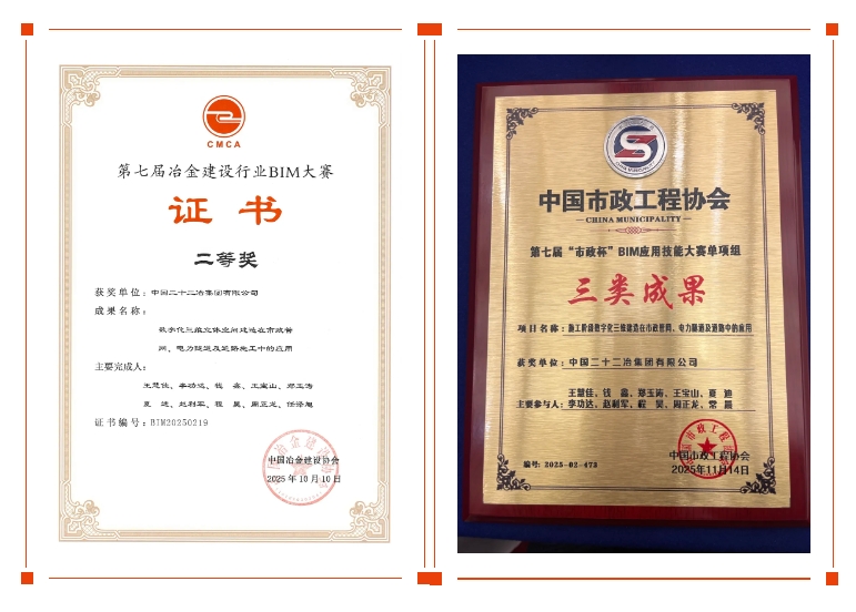 近日,路桥公司京唐智慧港项目成果“施工阶段数字化三维建造在市政管网、电力隧道及道路中的应用”一举斩获“中国冶金BIM大赛二类成果”“中国市政工程协会BIM大赛三类成果”两项行业殊荣,不仅展示了项目的技术创新实力,更标志着路桥公司在BIM应用领域实现重大突破,为数字化发展注入了新动能。